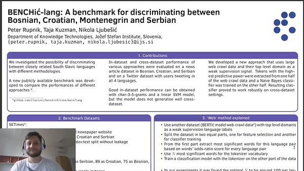 Taja Kuzman is a computational linguist with a MA degree in translation, pursuing a PhD in IT at the Jožef Stefan International Postgraduate School, Ljubljana, Slovenia. Her PhD research is focused on automatic genre identification. Taja works as a research assistant, developing language resources and technologies at the Department for Knowledge Technologies at the Jožef Stefan Institute, and co-leading the CLARIN Knowledge Centre for South Slavic languages CLASSLA. She is epecially active in text categorization tasks, web corpora collection and curation and machine translation.